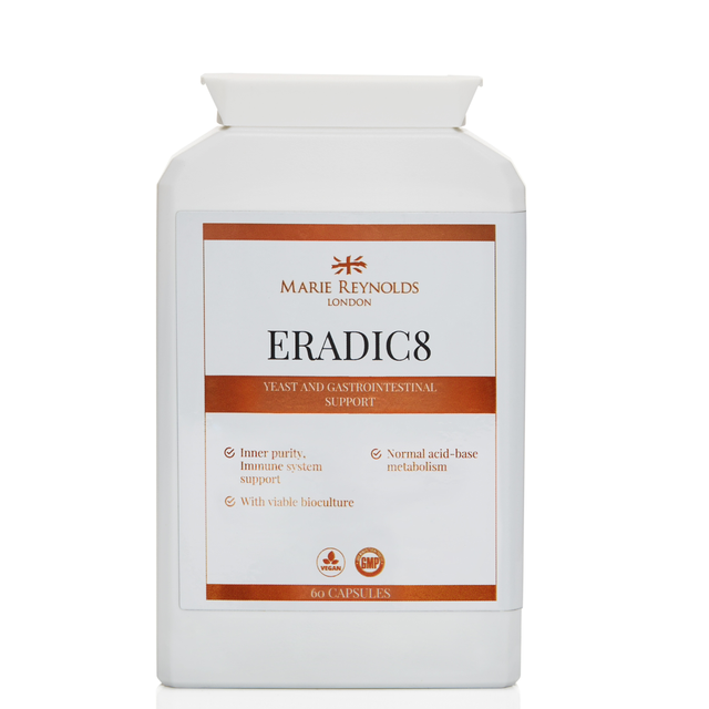 An all-in-one Candida yeast balance, digestion, colon health and detox support supplement. It contains 15 powerful ingredients, including active herbals, probiotics and other natural cleansing and protective agents, which have anti-bacterial, anti-fungal, anti-microbial and anti-inflammatory actions. This supplement helps to support the correct balance of gut micro-flora (bacteria and yeasts), integrity of the gastrointestinal tract and encourages the growth of friendly bacteria (probiotics), which of course reflects in the skin and reduces excessive inflammation and mucus. Ideal for use in conjunction with a low yeast and low sugar diet.